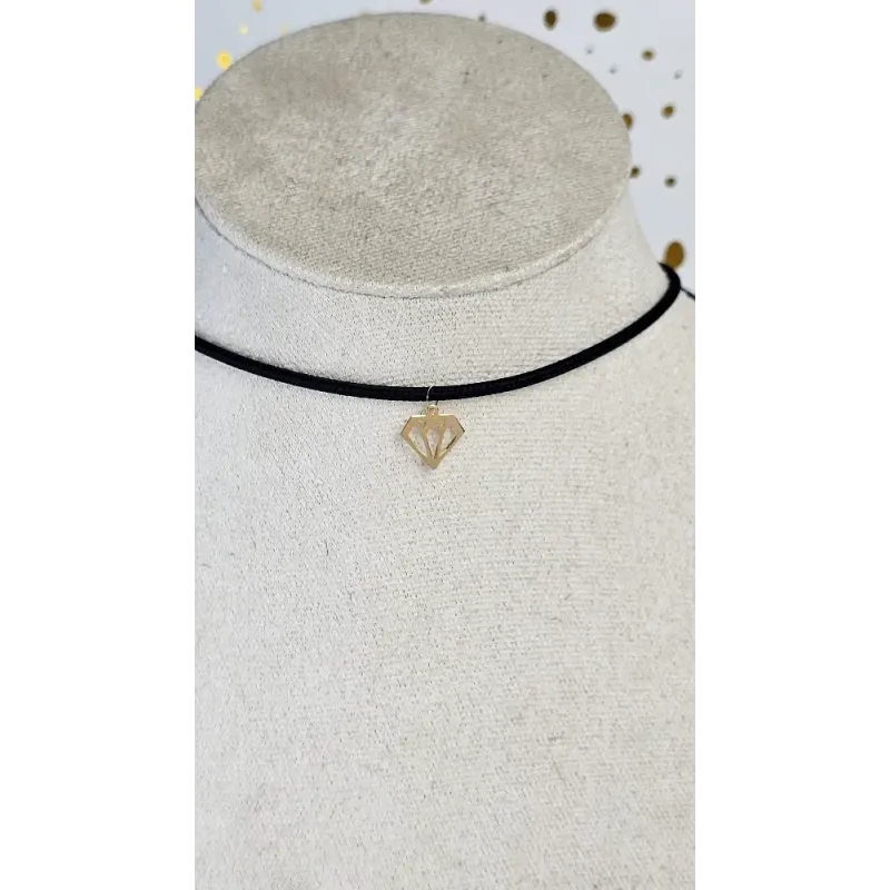 A sleek black choker necklace with an 18K gold diamond-shaped charm. Bold contrast, minimalist design, ideal for everyday or evening wear. Adjustable fit.