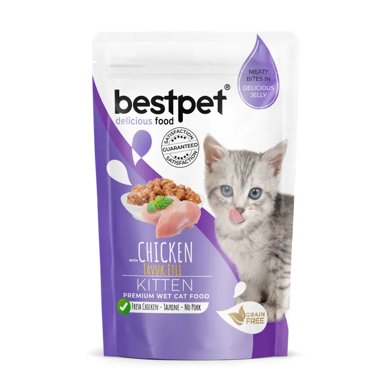 Bestpet Cat Kitten Chicken In Jelly 85 Grs is a specially formulated wet food for kittens. Made with tender chicken pieces in a savory jelly, it provides complete and balanced nutrition to support the growth and development of your kitten. Rich in high-quality protein, vitamins, and minerals, this formula promotes healthy growth, strong muscles, and a shiny coat. Perfect for kittens up to 12 months, it is easy to digest and ensures that your kitten receives all the essential nutrients.