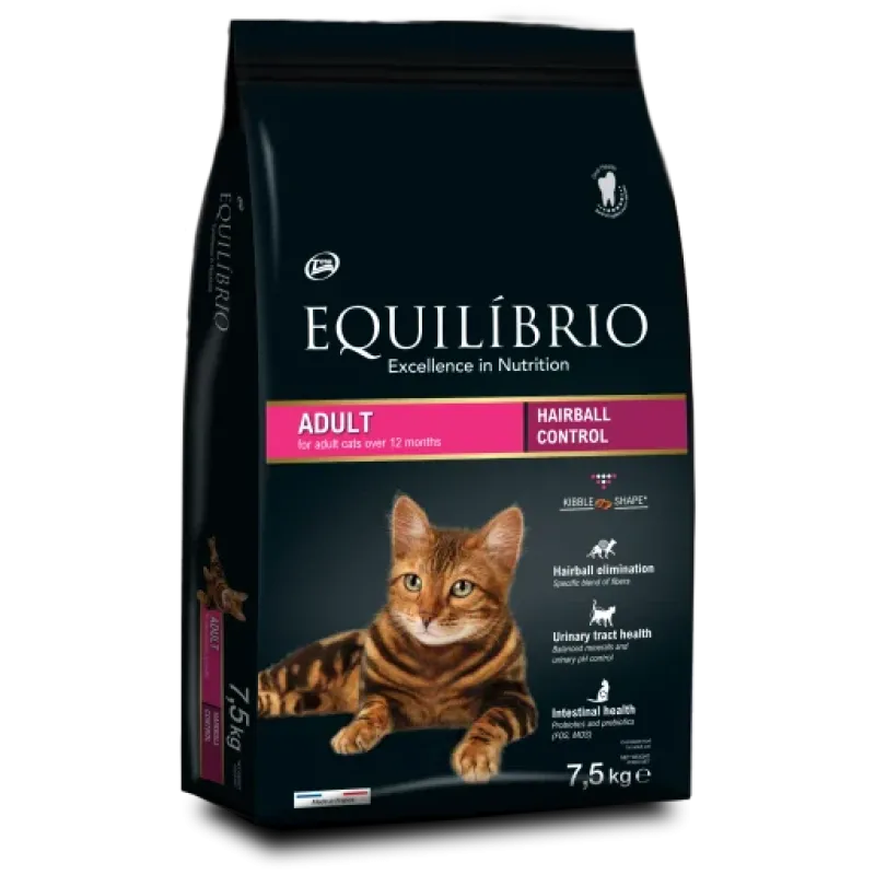 Equilibrio cat food is complete for adult cats. FOS/MOS & Probiotics Helps the balance of intestinal flora Hairball. A combination of ingredients to prevent hairballs in the digestive tract. Control of urinary pH Helps in the maintenance of urinary tract health Crude. Protein (Min.) 33%, Crude Fat (Min.) 18%, Crude Fiber (Max.) 3.5%, Moisture (Max.) 10%, Ash (Max.) 7%, Calcium (Max.) 1.1%, Phosphorus (Max.) 0.8%, Taurine (Min.) 0.18%, DL-methionine (Min.) 0.57%, Inulin (Min.) 0.55%, Mannan-oligosacharides (Min.) 0.3%, Probiotic (Min.) 1%. Metabolizable energy 4099 Kcal/kg. AAFCO (Association of American Feed Control Officials) feeding trials confirm that Equilíbrio is complete and balanced for cats.