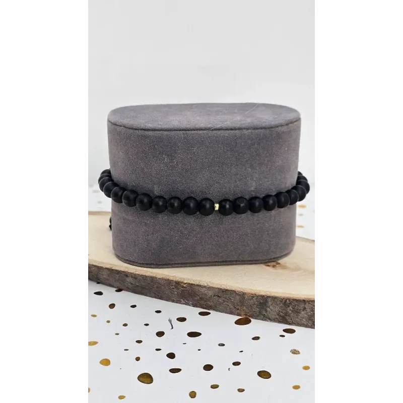 A sophisticated men's black beaded bracelet with an 18 carat gold bead accent. Simple, masculine, and effortlessly stylish for daily wear. Elastic fit.