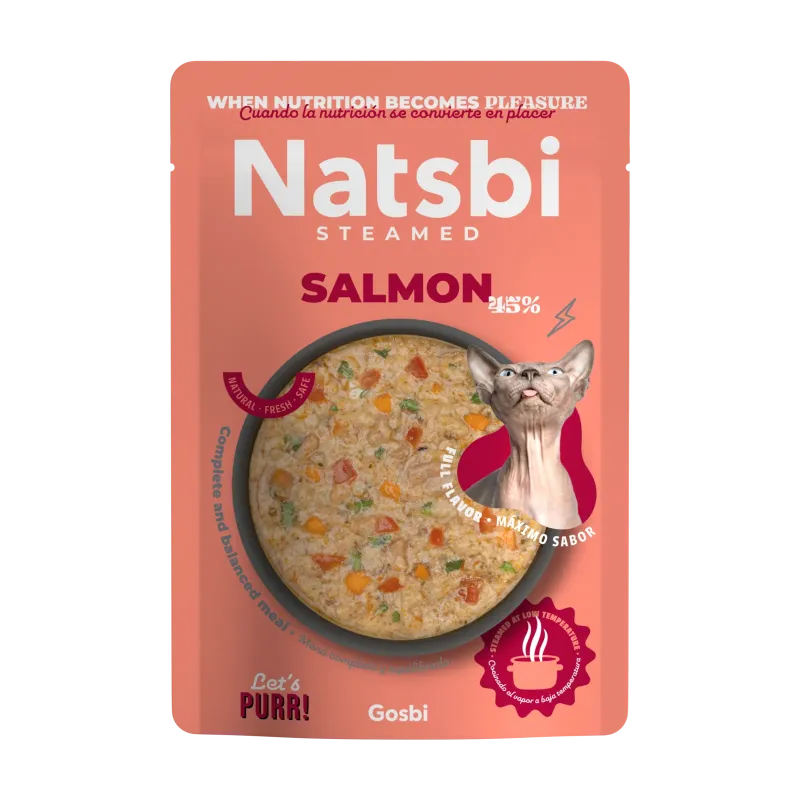 Natural Steamed Wet Food for Cats with Irresistible Taste. Grain Free, with Fresh Meat and Fish and No Artificial Preservatives or Addatives. Added Taurine for a Healthy Heart.