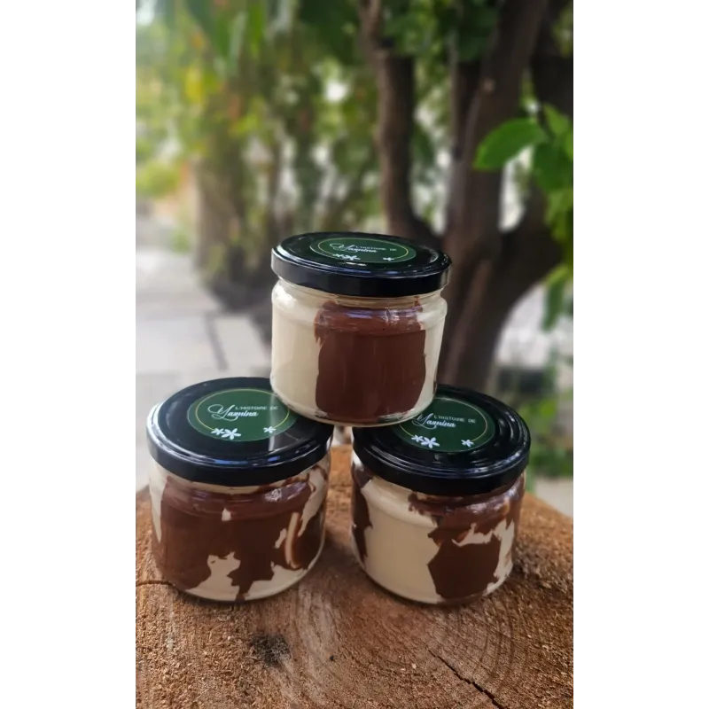 Yasmina Diet Spread Halawa Cream With Nutella is an irresistible sugar-free fusion of traditional Lebanese halawa cream and the beloved flavour of nutella-style chocolate hazelnut. Made by L'Histoire De Yasmina in small homemade batches, this baladi spread delivers a rich, velvety texture that melts on the tongue. Free from refined sugar, it satisfies sweet cravings the healthy way. Spread it on toast, use it as a dip for fruits, or enjoy it with crackers for a special treat. A creative Lebanese twist on a classic flavour, crafted with love and organic ingredients.