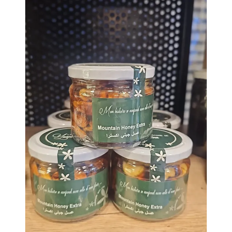 Yasmina Extra Honey With Raw Nuts is a luxurious homemade treat crafted by L'Histoire De Yasmina — pure, raw Lebanese baladi honey blended with a generous mix of natural raw nuts. Every jar is made in small batches using honey sourced directly from Lebanese mountains, preserving all of its natural enzymes and rich floral aroma. The crunchy nuts add a delightful texture and an extra layer of nourishment, making this a perfect energizing snack or a wholesome gift. A true taste of authentic Lebanese tradition, made with love and the finest organic ingredients.