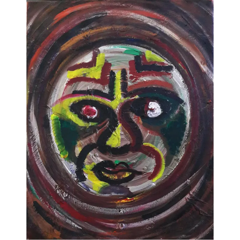 Type: Oil painting on stretched canvas. Sides painted. Brushes and palette knife. | Size: 35 * 45 * 1.5 cm | Weight: 2 kg | Utensils: Brushes and palette knife. | Year: 2012 | Description: Colourful brown African tribal style mask painting contrasting with yellow on a circular background. Round faced Tribal African style portrait.